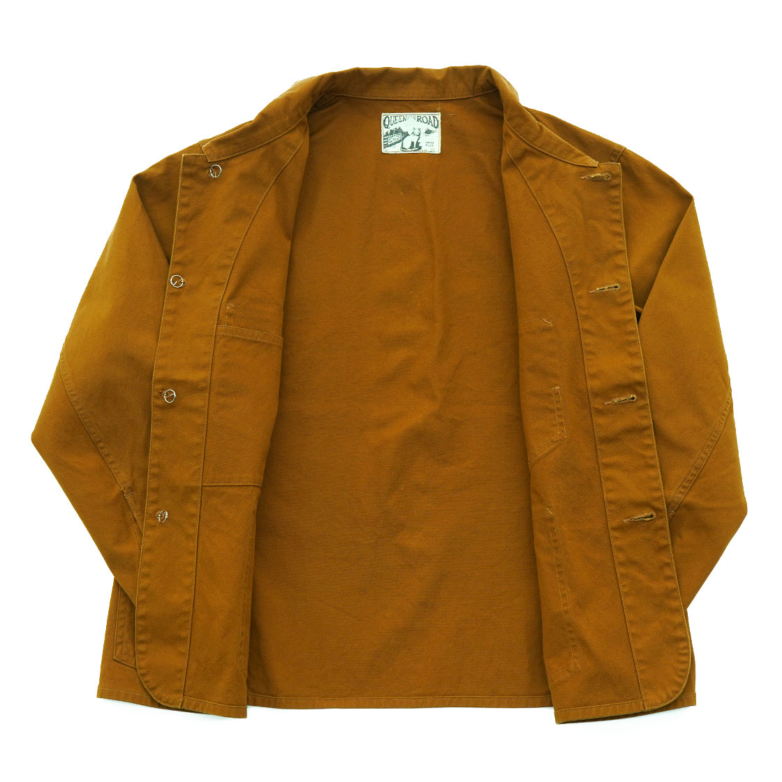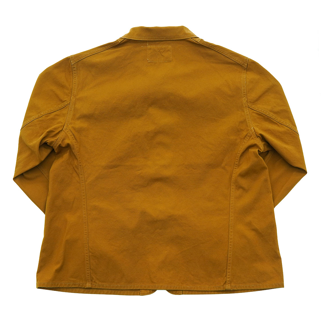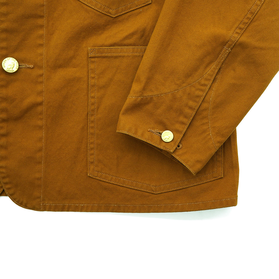 ブラウンダックは9オンスと軽めで、染料は反応染めで色落ちもしにくく、糸もムラではなくストレートにしています。あえてそっけない見た目のほうが「ダックらしい」と判断。デニムより生地が固く、こすれたエッジが毛羽だって、さらに毛羽がはがれてくるとビンテージらしさが出てくるのが狙い。ボタンはオリジナルのチェンジボタンです。