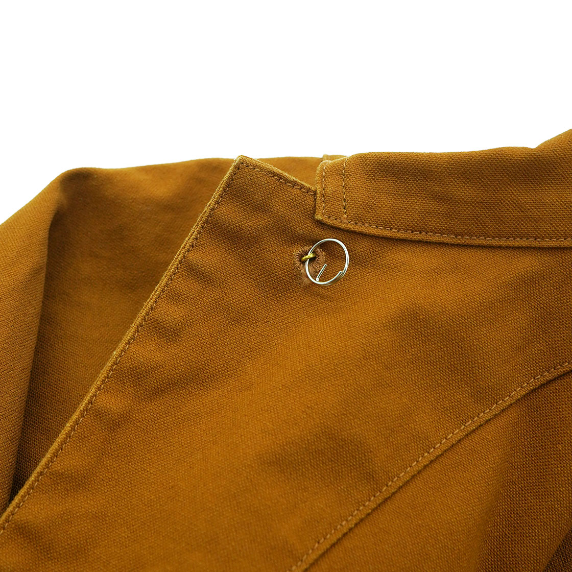 襟は台襟がなく、頼りないくらいシンプル。襟のダブルステッチには二本針は使っていない設定なので、角にチョウチョ(三角の糸のワタリ)は出ないという仕様。左胸側はウォッチ&ペンポケット。懐中時計は使われなくとも、古いカバーオールを象徴するディテール。ポケットの角の補強も、カンヌキを使わずステッチで止めるのも、古いカバーオールのディテールです。