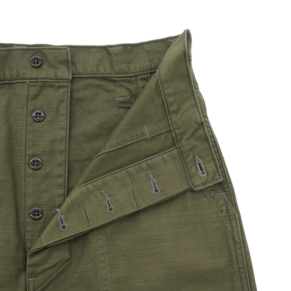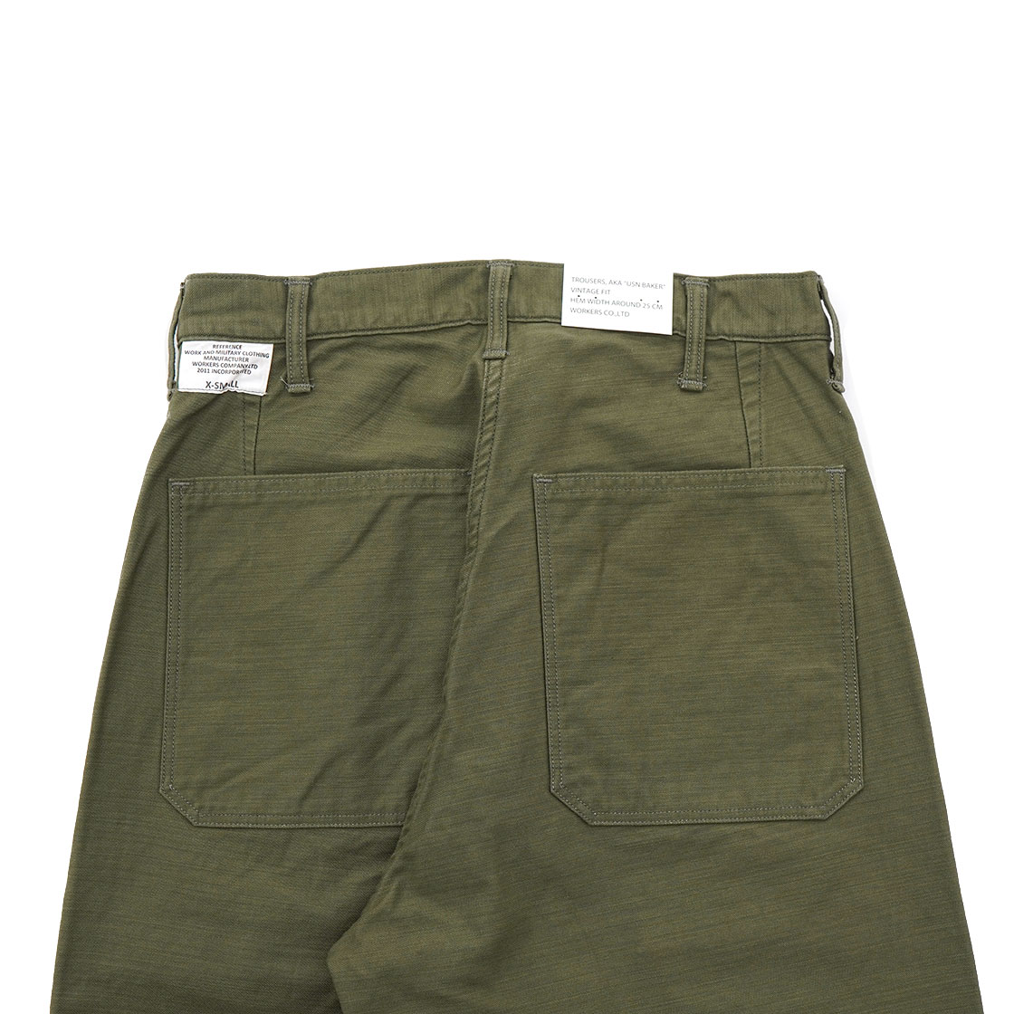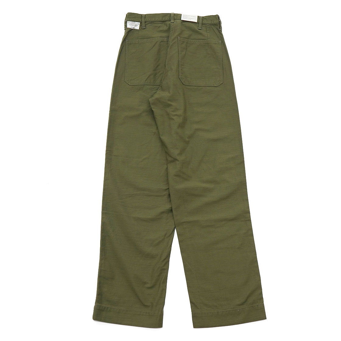 まずはヒップ部分にダーツが無い事。ベイカーではウエストのボタンで絞って、ストラップで留めることでダーツの役割を果たしていますが、USNベーカーは背面にダーツが有ります。次にベイカーパンツと言えばのフロントポケットの形。こちらも似ていますが、USアーミーベイカーは表から縫い付けられ停るのに対し、USNベーカーは裏側にたたきつけています。腰の帯部分も、USアーミーベイカーは身頃がそのまま続いていて、裏側に見返しがつきますが、USNベーカーは別パーツが帯状についています。後ろポケットもUSNベイカーはフラップが無くシンプルな構造。全体的にスッキリとした印象です。