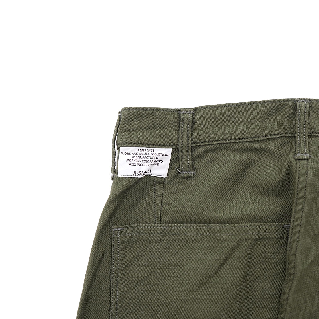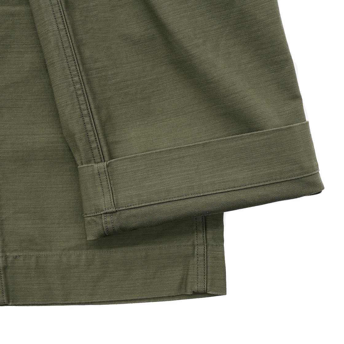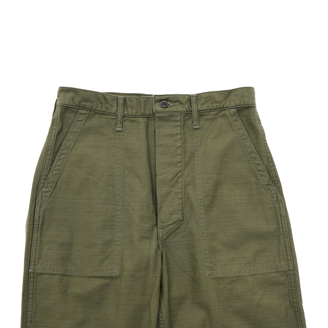 まずはヒップ部分にダーツが無い事。ベイカーではウエストのボタンで絞って、ストラップで留めることでダーツの役割を果たしていますが、USNベーカーは背面にダーツが有ります。次にベイカーパンツと言えばのフロントポケットの形。こちらも似ていますが、USアーミーベイカーは表から縫い付けられ停るのに対し、USNベーカーは裏側にたたきつけています。腰の帯部分も、USアーミーベイカーは身頃がそのまま続いていて、裏側に見返しがつきますが、USNベーカーは別パーツが帯状についています。後ろポケットもUSNベイカーはフラップが無くシンプルな構造。全体的にスッキリとした印象です。