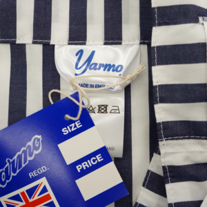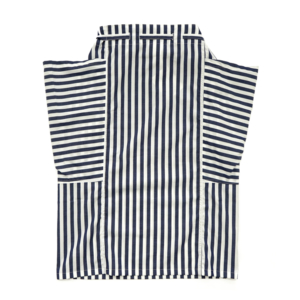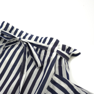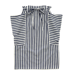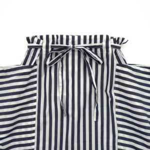 ワークウエアによく使われるストライプ柄のスカートに、柄の向きを変えポケットを取り付けているだけなのですが、これがとても良いアクセントになっています。